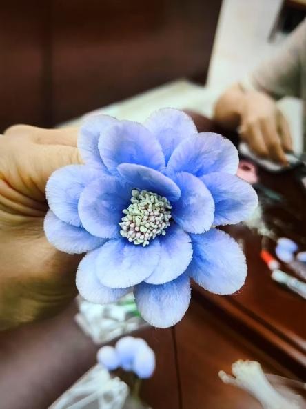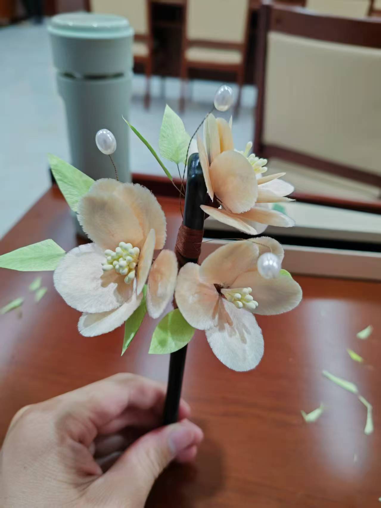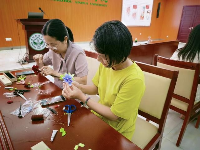 在实践环节中,教职工们利用桌面上的材料,充分施展创造力,制作出了一系列独具特色的绒花作品。
