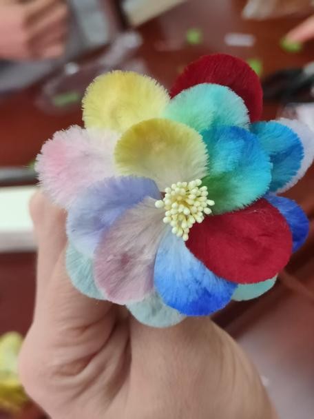 绒花制作,作为传统手工艺的瑰宝,与时尚的韵味巧妙融合,展现了其无与伦比的魅力。在这次活动中,我们有幸目睹了老师们精湛技艺与无限创意的结晶——那些精美的绒花作品。每一件作品都凝聚了老师们对美的不懈追求和对传统文化的深厚情感。它们不只是手工艺品,更是教育工作者才华横溢、多才多艺的生动体现。每一瓣花瓣都是色彩的奇妙旅程,从明艳到柔和,从浓郁到淡雅,展现出无与伦比的绚丽与梦幻,让人仿若置身于童话般的花境。