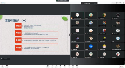 讲座伊始,程圆讲师通过在支行网点一线工作发生的真实事例向员工讲述了网络贷款的常用伎俩以及给家庭带来的危害,接下来,程圆讲师就校园贷的定义、套路形式及类型作了说明,借电视剧《扫黑风暴》中的警醒案例生动形象地解读了“美丽贷”“裸贷”后果危害,加深员工对非法贷款的层层套路的认识,引导员工正确识别校园贷并加以防范,并忠告员工一定要建立理性的消费观念。