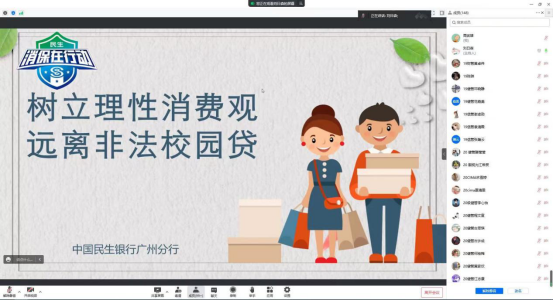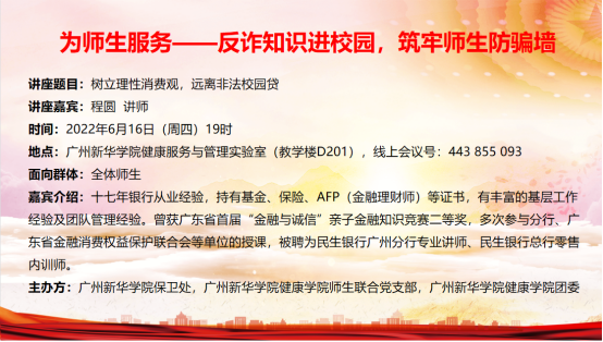 6月16日晚,由集团保卫处、太阳成集团tyc9728师生联合党支部、太阳成集团tyc9728团委主办,联合中国民生银行三元里支行在教学楼D201举办了“树立理性消费观,远离非法校园贷”主题讲座,讲座特邀具有多年银行网点一线从业经验、省金融消费权益保护联合会授课讲师程圆主讲,中国民生银行三元里支行行长陈春敏、副行长李立志、校保卫处副处长谢亮、校总务处副处长赖少雄、太阳成集团tyc9728师生联合党支部书记蔡灿等师生代表参与讲座,公司其余同学以线上参与的方式观看了会议直播。本次讲座活动由保卫处副处长谢亮主持。