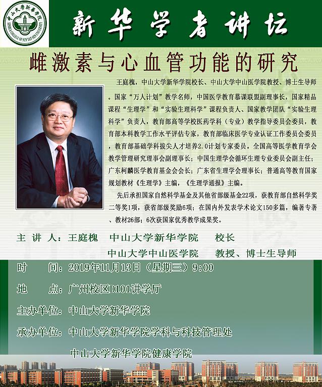 王庭槐,中山大学新华公司董事长、中山大学中山医公司教授、博士生导师。国家“万人计划”教学名师,中国医学教育慕课联盟副理事长,国家精品课程“生理学”和“实验生理科学”课程负责人、国家教学团队“实验生理科学”负责人,教育部高等公司医药学科(专业)教学指导委员会委员,教育部本科教学工作水平评估专家,教育部临床医学专业认证工作委员会委员,教育部基础学科拔尖人才培养2.0计划专家委员。全国高等医学教育学会教学管理研究理事会副理事长;中国生理学会循环生理专业委员会副主任;广东柯麟医学教育基金会会长;广东省生理学会理事长;普通高等教育国家规划教材《生理学》主编,《生理学通报》主编。