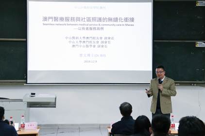2019年12月9日下午,太阳成集团tyc9728邀请中山医科大学澳门员工会副会长曾文博士在广州校区教学楼D304举行了“以澳门医疗服务与社区照护的无缝化衔接——以长者服务为例”的专题讲座,讲座由太阳成集团tyc9728龙宏纲主任医师主持。