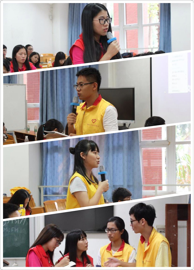 为进一步拉近彼此之间的距离,暨大青年志愿者协会还准备了神秘的热身环节。由问题“公益+水杯=?”、“公益+黑板=?”、“公益+眼镜=?”而联想到哪些公益志愿活动呢?两校双方针对这些问题掀起了一场激烈且愉快的头脑风暴。