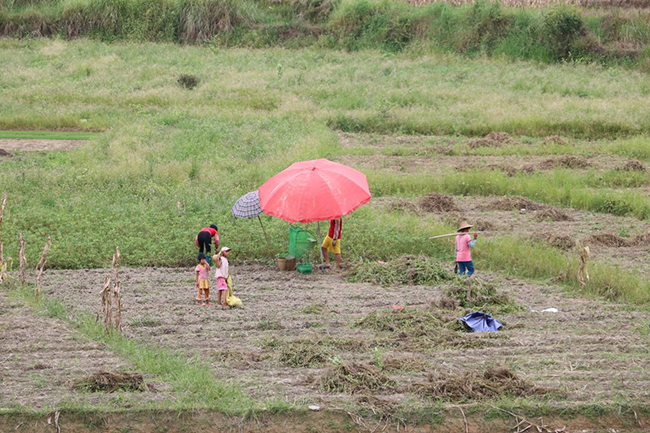 看这,这是他们的田地。我们在途中看到了他们正在割稻谷。