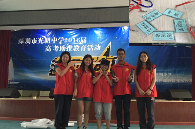 2015年10月25日,深圳市光明中学组织高三员工进行为期一天的生命导航——“高考助推”活动。我系“凌霄志愿服务队”秉承服务他人、服务自我的理念,派出5名志愿者,以助教的身份参与此次的高考助推活动。