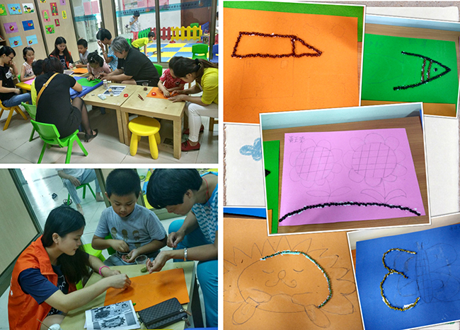 我系志愿者在教导小朋友制作豆画及小朋友第一节课的成果展