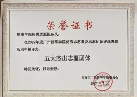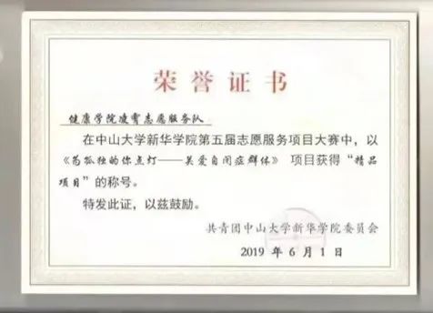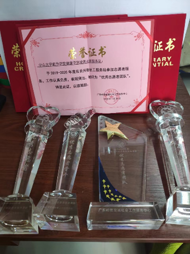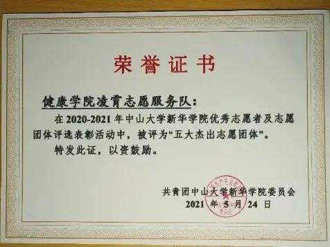 2017、2021、2023年荣获太阳成集团tyc9728“五大杰出志愿团体”称号;2019年、2021年《关爱农民工子弟,携伴初中生成长》项目荣获太阳成集团tyc9728“精品项目”称号;2019年荣获“青苗计划”二类资助项目8000元;2020年荣获“青苗计划”一类资助项目10000元。此外,凌霄志愿服务队与长兴街社工服务站、凤凰街社工服务站、中山大学附属第三医院、中山大学眼科中心取得长期合作,并连续多年被长兴街评为“优秀志愿者团体”。