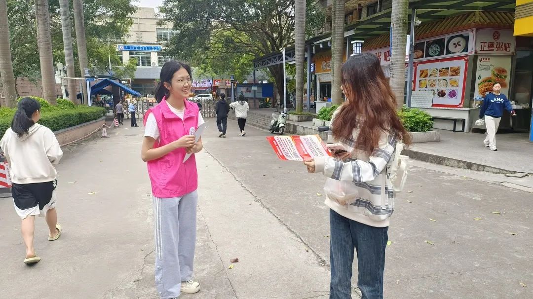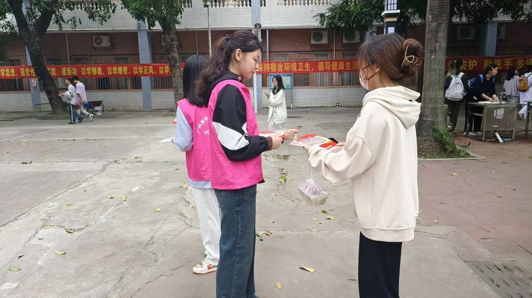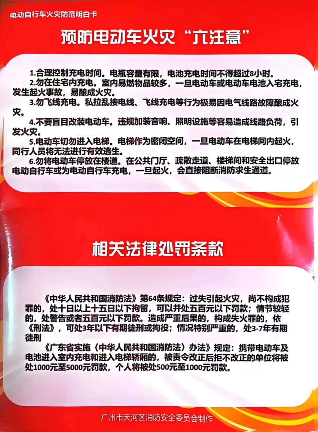 本次宣传活动主要以志愿者派发、张贴电动车安全宣传单为主,同时老师们也参与了宣传活动。志愿队派发的传单是广州市天河区消防安全委员会制作的电动自行车火灾防范明白卡,这张卡上简洁明了地介绍了预防电动车火灾的六种注意事项与相关法律条款。