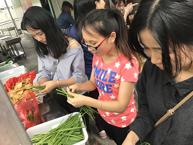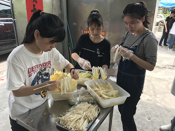 我们辛勤的小班干们把活动物资搬到烧烤场后就贤良地开始处理食材了。随着越来越多的同学陆续到达,即使不用分配工作,同学们都非常自觉地分工合作,摘菜、洗菜、穿串等烧烤前准备工作很快就完成了。