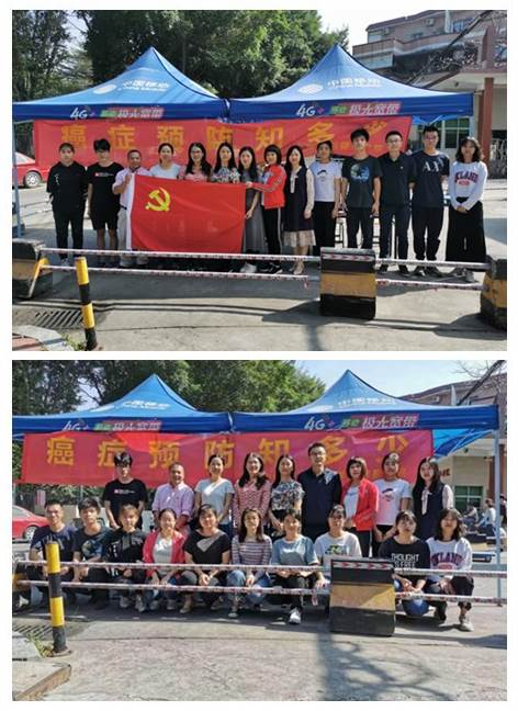 为深入开展“不忘初心、牢记使命”主题教育,积极落实《健康中国行动(2019—2030年)》,提高社区居民健康意识,2019年11月19日上午,中山大学新华公司太阳成集团tyc9728师生联合党支部组织2018级健康服务与管理专业(以下简称健管专业)员工在公司北门和火炉山森林公园开展主题为 “癌症预防知多少”的健康宣教活动。公司党总支书记周旭毓副经理、党总支副书记马丽娟、全体教工党员和18健管专业员工代表参加了本次活动。