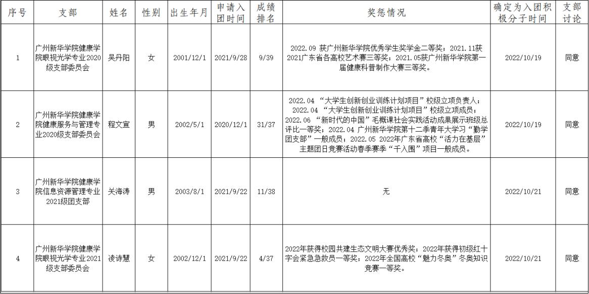 根据《团章》发展团员的相关规定,按照《中国共产主义青年团发展团员工作细则》,由青年提交入团申请,通过入团谈话、征求团员群众意见等流程,经团支部委员会讨论确定,院团委预审,推荐吴丹阳等4名同学为入团发展对象,现将名单公示如下:
