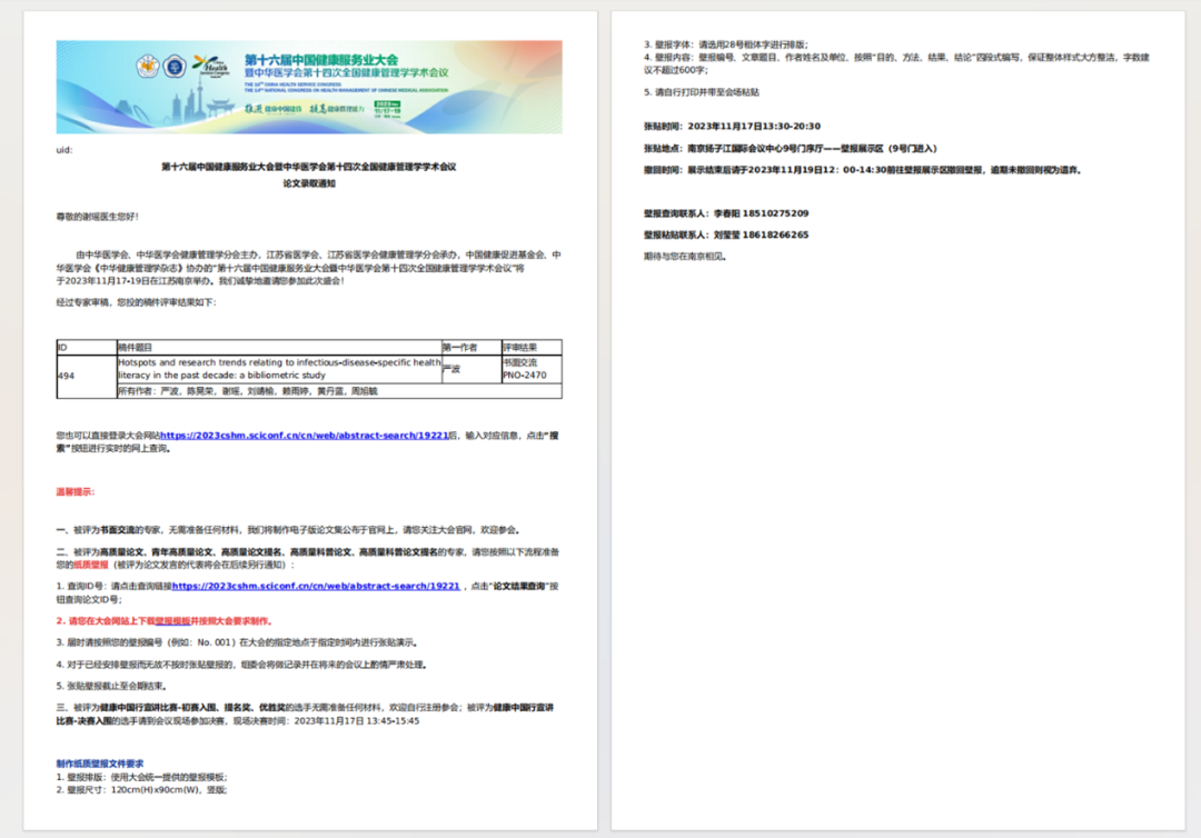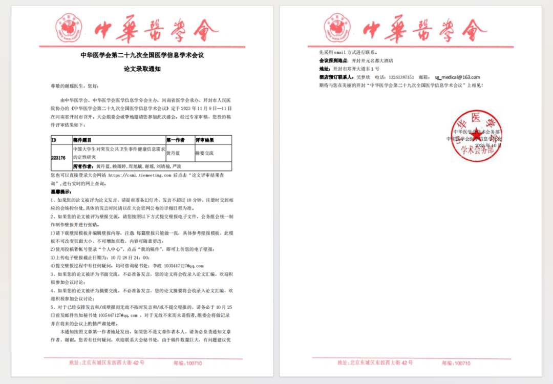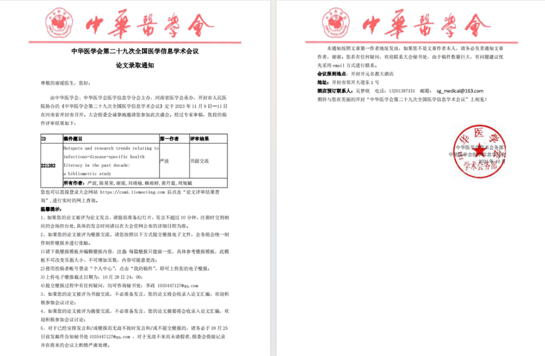 (2)2023年10月,作为第三作者参与论文《中国老员工对突发公共卫生事件健康信息需求的定性研究》撰写、作为第四作者参与论文《Hotspots and research trends relating to infectious-disease-specific health literacy in the past decade: a bibliometric study》撰写并被录用,在中华医学会第二十九次全国医学信息学术会议上分别作摘要交流和书面交流。
