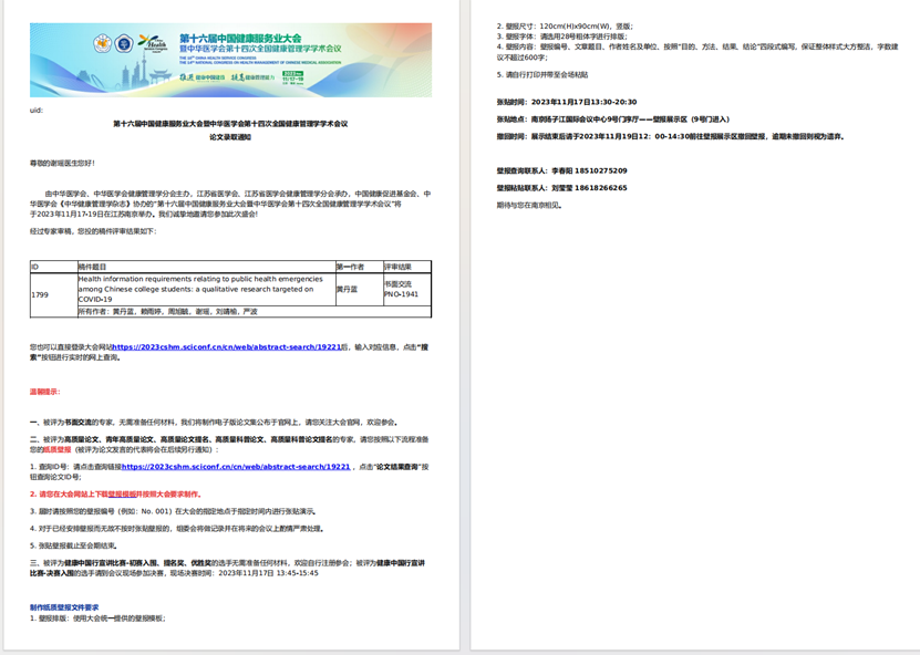 (1)2023年10月,作为第四作者参与论文《Health information requirements relating to public health emergencies among Chinese college students: a qualitative research targeted on COVID-19》撰写、作为第三作者参与论文《Hotspots and research trends relating to infectious-disease-specific health literacy in the past decade: a bibliometric study》撰写并被录用,在第十六届中国健康服务业大会暨中华医学会第十四次全国健康管理学学术会议上进行书面交流。