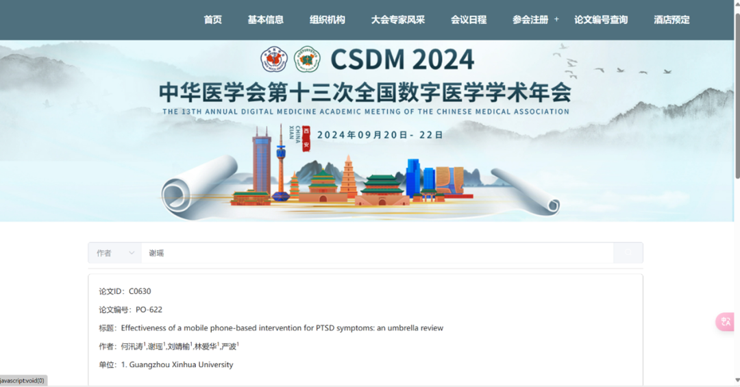 (3)2024年8月,作为第二作者参与论文《Effectiveness of a mobile phone-based intervention for PTSD symptoms: an umbrella review》撰写、作为第一作者参与论文《Effectiveness of intemet based self- help intervention for anxiety among adolescents and young adults: a systematic review and meta-analysis》撰写并被录用,被邀请在中华医学会第十三次全国数字医学学术年会进行口头发言。
